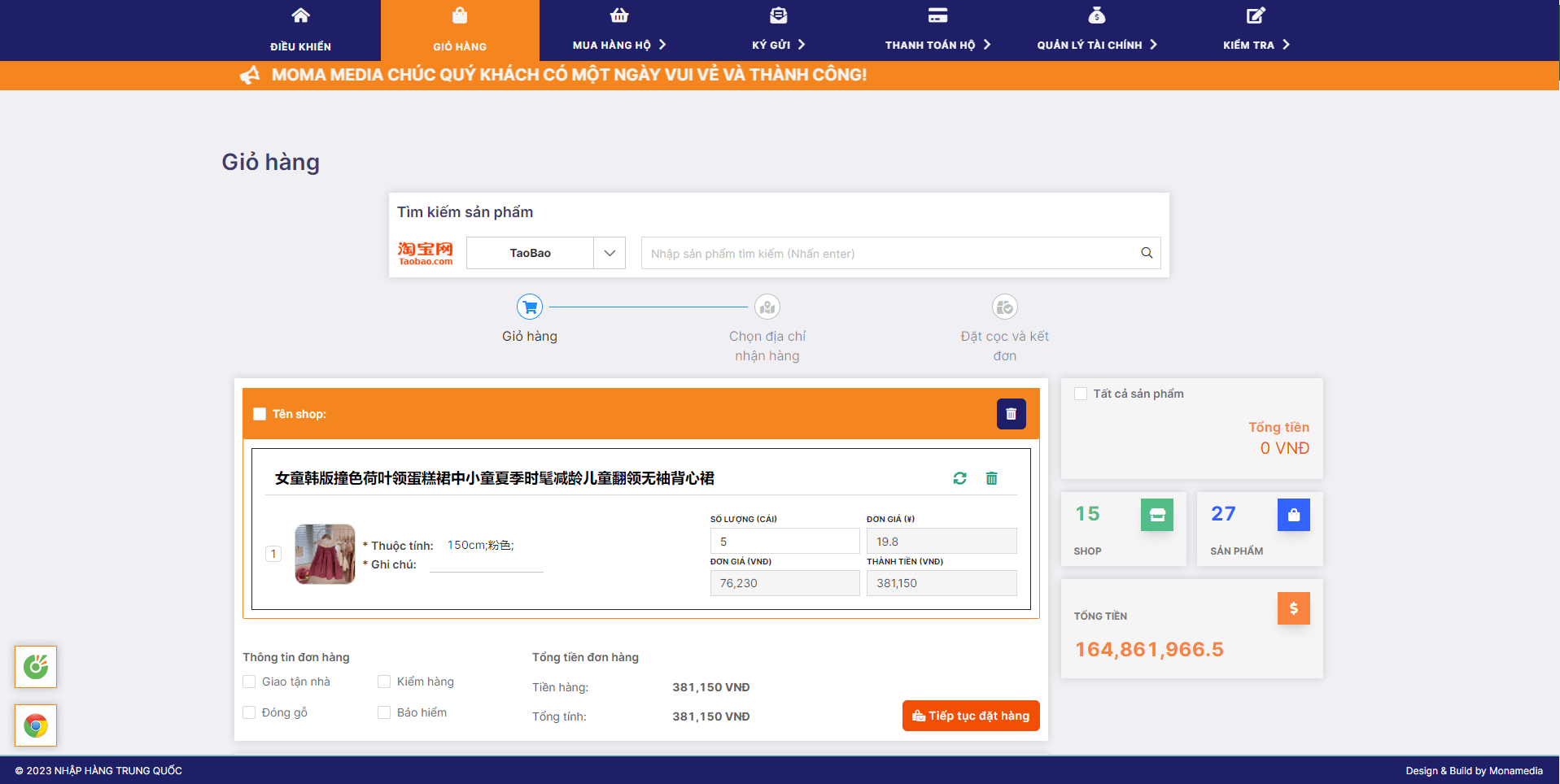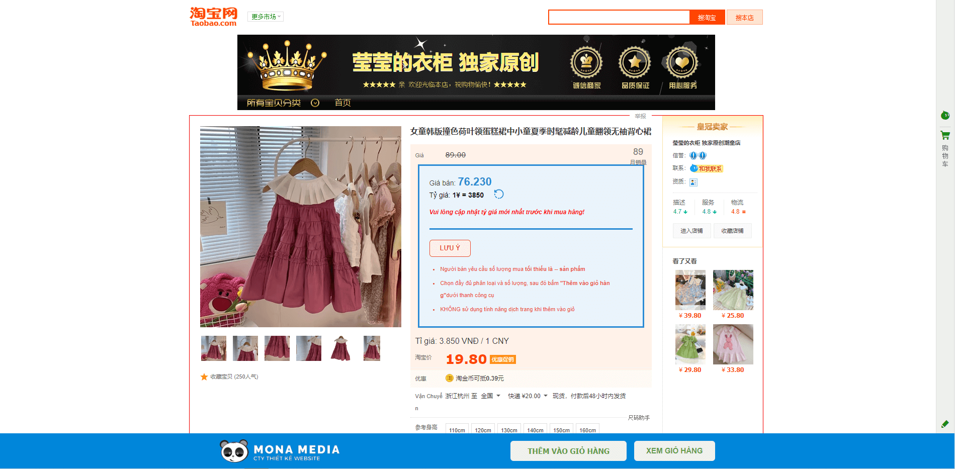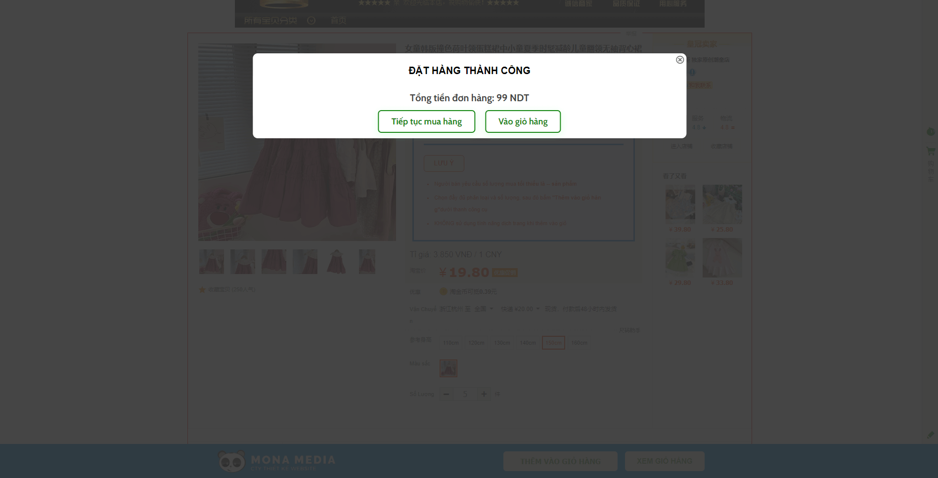 Sau khi đã cài đặt công cụ đặt hàng, khách hàng vào các trang web Trung như trangđặt hàng Taobao/ 1688/ Tmall... sẽ có CCĐH xuất hiện phía dưới màn hình. Chọn thuộc tính và số lượng sản phẩm như hướng dẫn có sẵn và"Thêm vào giỏ hàng"