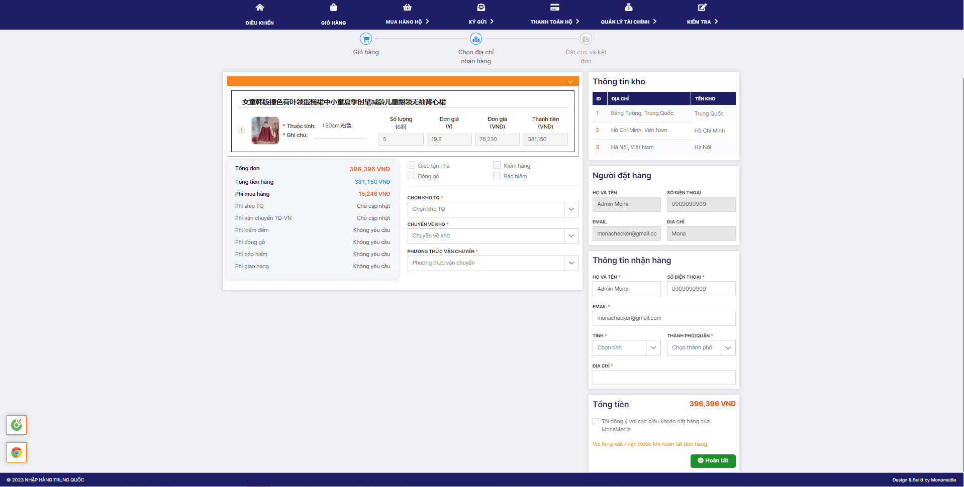 Tiếp thao bấm vào nút " Hoàn tất " để hoàn thành quá trình lên 1 đơn hàng trên hệ thống nhập hàng Trung Quốc của faros.vn. Sau khi vào danh sách đơn hàng khách hàng có thể đặt cọc để BQT nhận được thông tin đơn hàng của khách hàng để tiến hành mua hàng đúng với các thông tin sản phẩm trong đơn hàng vừa tạo.